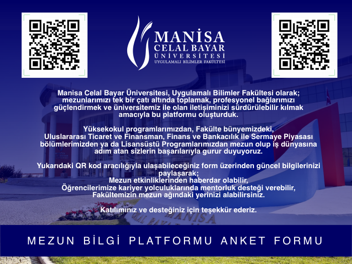 Adres : Manisa Celal Bayar Üniversitesi, Uygulamalı Bilimler Fakültesi, Şehit Prof.Dr. İlhan Varank Kampüsü 45140 Yunusemre/MANİSA